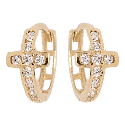 Cross Hoop Huggies Earring Cubic Zirconia Yellow Gold 14k